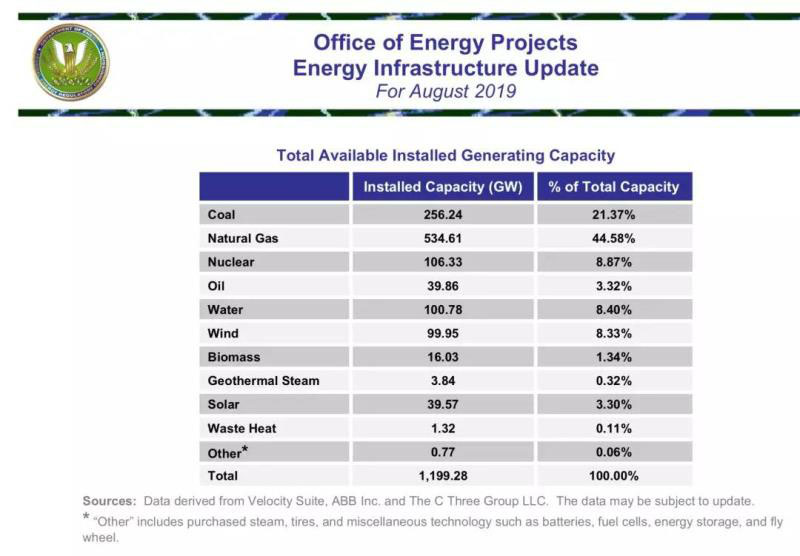 根據(jù)美國能源監(jiān)管委員會(FERC)匯總的數(shù)據(jù),截至2019年8月底,美國發(fā)電裝機(jī)總?cè)萘繛?199.28吉瓦(11.99億千瓦),其中各類能源發(fā)電裝機(jī)及其比例如下:
