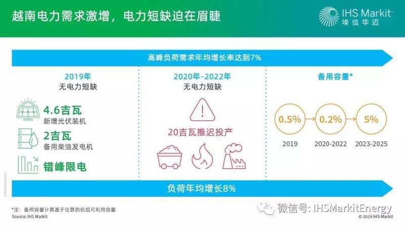 在2019年高溫天氣時(shí)段,水庫(kù)水位下降導(dǎo)致水電可利用容量銳減的不利條件下,越南仍成功避免了電力短缺的局面。這要?dú)w功于三點(diǎn)。首先,EVN公開(kāi)呼吁居民和企業(yè)節(jié)約用電;其次,EVN動(dòng)用了約2吉瓦成本高昂的柴油發(fā)電;第三,在2019年6月30日光伏補(bǔ)貼截止日期之前,光伏裝機(jī)規(guī)模大增4.6吉瓦。