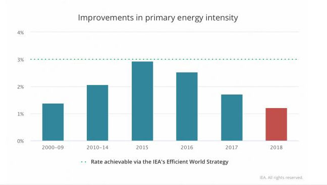 國際能源署(IEA)發(fā)布2019年版能源效率報告(Energy Efficiency 2019),指出2018年全球一次能源強度(衡量全球經(jīng)濟用能量的重要指標)僅改善了1.2%,明顯低于2017年1.7%的改善速度,這是該比率連續(xù)第三年下降,為2010年以來的最低水平。這也遠低于IEA在2018年能源效率報告中首次提出的“高效世界戰(zhàn)略”(Efficiency World Strategy)的3%的平均改善率。