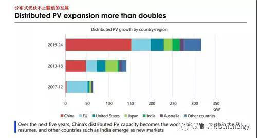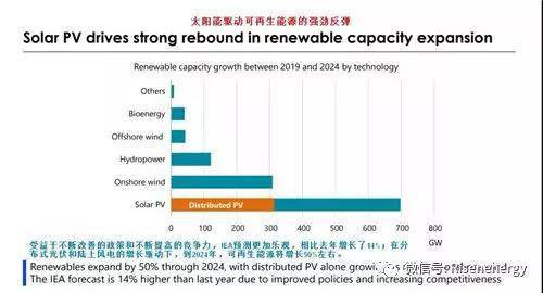 報(bào)告預(yù)測(cè),2019年至2024年期間,全球可再生能源裝機(jī)量將達(dá)到1200GW,增長50%;可再生能源在全球發(fā)電中的比重將從今天的26%上升到2024年的30%。其中,光伏將占新增裝機(jī)中的60%左右。