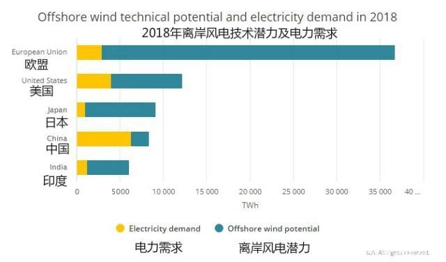 該報(bào)告指出,僅開發(fā)近岸的主要風(fēng)力電場所能提供的電力就已超過當(dāng)今全球消耗的電力總量。但是,海上風(fēng)電所能生產(chǎn)的最大潛力超過120億千瓦,是 2040 年預(yù)計(jì)全球電力需求的11倍,不過這個(gè)估算并未將傳輸和儲存電力的困難納入考慮范圍。