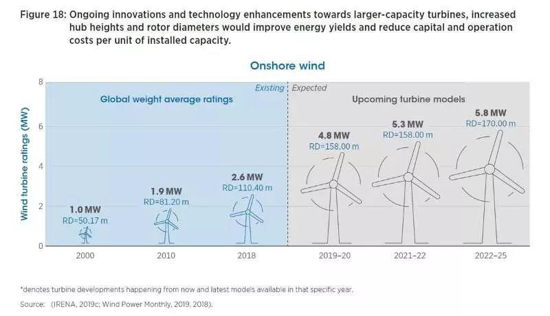 根據(jù)國(guó)際可再生能源署(IRENA)在《未來(lái)風(fēng)能》報(bào)告預(yù)測(cè),陸上風(fēng)電應(yīng)用的渦輪機(jī)單機(jī)容量將從2018年的平均2.6兆瓦(葉輪直徑110米)增加到2025年的5.8兆瓦(葉輪直徑170米)。