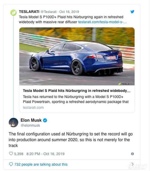 特斯拉CEO在推特上跟帖并對(duì)該報(bào)道進(jìn)行了回應(yīng),馬斯克表示,正在紐博格林上進(jìn)行測(cè)試、搭載了Plaid三電機(jī)系統(tǒng)的特斯拉Model S P100D+車型預(yù)計(jì)將在2020年夏季投入生產(chǎn)。
