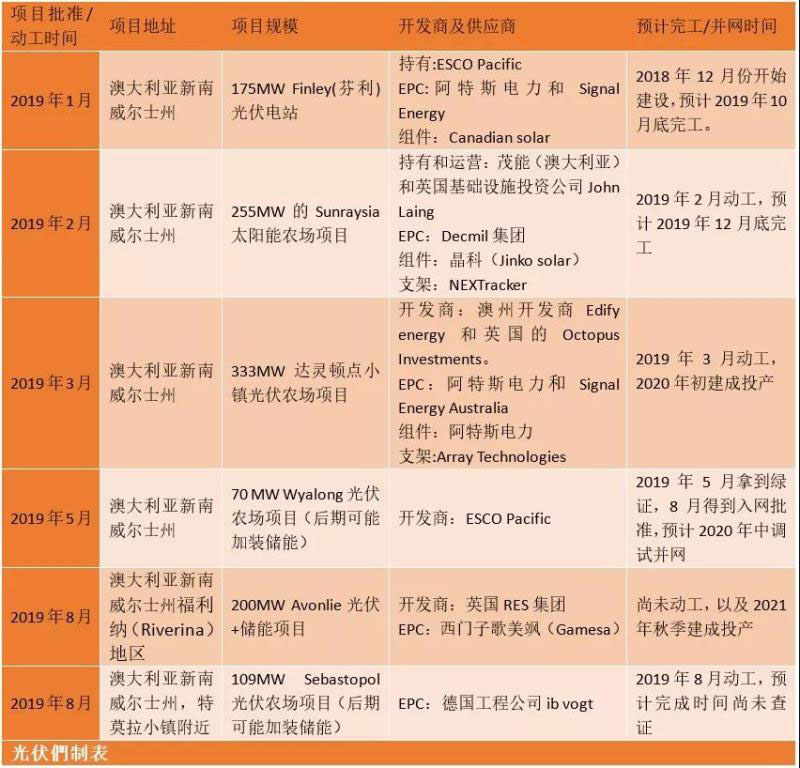 除了以上幾個(gè)項(xiàng)目之外,光伏們將今年年初至八月底的大型地面項(xiàng)目做了一個(gè)詳細(xì)的整理(項(xiàng)目地址基本都是在新南威爾士州),如下表所示: