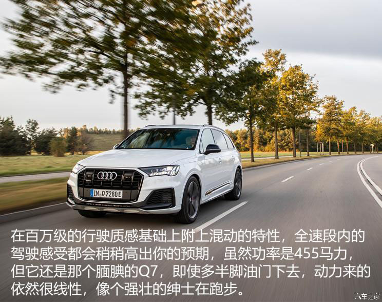 聊回我體驗的Q7 60 TFSI e,其實這套插電混動系統(tǒng)在2017年就已發(fā)布,發(fā)動機是接班一代名機3.0機械增壓的3.0T渦輪增壓發(fā)動機,作為RS6那臺4.0T發(fā)動機的“減缸版”,本身的功底就不軟,發(fā)動機最大功率為250kW(340馬力),所以配合插電混動后也是達到了455馬力,扭矩更是達到700N·m,對于一般使用者來說這種數(shù)字已經(jīng)算是過度儲備了。