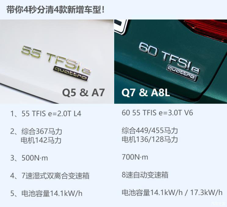如果要區(qū)別4款車,很簡單,Q5 e-tron和A7 e-tron是2.0T 4缸車,尾標是55 TFSI e;A8L e-tron和Q7 e-tron是3.0T 6缸車,尾標是60 TFSI e。對于后兩者這種大塊頭來說,從這種搭配看就已經(jīng)顯得更加合理了,要知道之前在國內(nèi)銷售過的老款Q7 e-tron還是EA888 2.0T的發(fā)動機承載的混動系統(tǒng)??傊皼]有的有了,之前有的升級了。