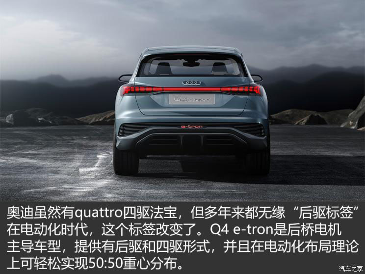電動化時代的機械結(jié)構(gòu)的束縛被打破,一些所謂的“特性”也就隨之化解,就拿Q4 e-tron來說,即將是一款空間還不錯+后驅(qū)主導(dǎo)(標配后驅(qū),可選四驅(qū))+接近50:50重心+造型比Q3舒展的小SUV,這也是電動化之后,不同的車企都會發(fā)生的一些有趣的改變。
