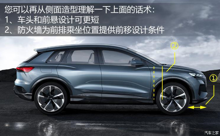 車頭沒有了占地方的發(fā)動機后,前機艙和駕駛艙之間的防火墻,就比汽油車要前移了一些,把更多空間留給車內(nèi),你可以看到車頭的長度占車身長度的比例也要比Q3要少,這對于歐洲車型標準尺寸下空間不占優(yōu)勢的慣例是個可以借題發(fā)揮的利好,你會發(fā)現(xiàn)之前日系車在國產(chǎn)后很少做加長,是因為它們對于空間利用率的理解方式與德國人有所差異造型不同的結(jié)果,就像是外觀尺寸并不大的CR-V已經(jīng)擁有很多全尺寸SUV的后排空間,所以很可能未來奧迪的電動化產(chǎn)品會在全球范圍內(nèi)甩掉尾標上的“L”,畢竟“L”也會消耗一些成本。
