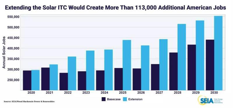 根據(jù)美國太陽能產(chǎn)業(yè)協(xié)會(huì)(SEIA)和伍德-麥肯茲日前發(fā)布報(bào)告預(yù)測,如果美國國會(huì)將太陽能投資稅收抵免(ITC)延長至2030年,將引發(fā)870億美元的私營部門追加投資,并使美國的就業(yè)機(jī)會(huì)比基準(zhǔn)估計(jì)數(shù)增加113,000個(gè)。