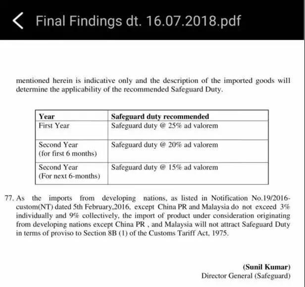 2021年4月1日 開始對光伏組件加征10%,自2022年1月1日起提高到20%,到2023年將加征30%的保障稅;2022年1月1日起對所有進口電池片加征15%,自2023年1月1日起提高到30%的保障稅。(文中還提到為了振興“印度制造”對光伏產(chǎn)品其他原材料如硅片、EVA、玻璃、銀漿、鋁邊框等暫不征保障稅)。