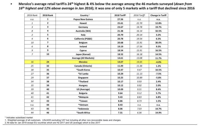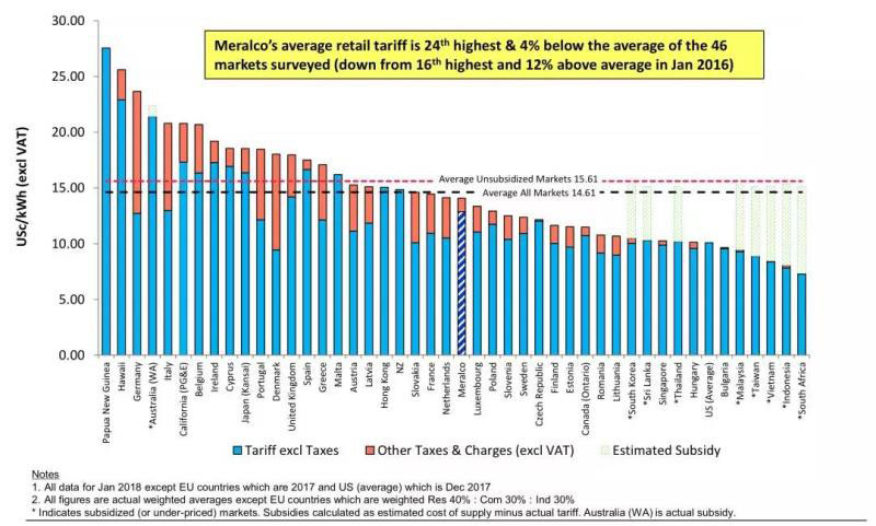 菲律賓電價(jià)較高,常有媒體說(shuō)馬尼拉的電價(jià)水平是全亞洲最高。這樣的說(shuō)法對(duì)菲律賓的投資環(huán)境和社會(huì)輿論很不利,于是馬尼拉電力公司(Meralco)定期聘請(qǐng)國(guó)際專家對(duì)全球各地46個(gè)國(guó)家或地區(qū)的電力市場(chǎng)電價(jià)(不包括稅費(fèi))進(jìn)行評(píng)估,最近一次評(píng)估是在2018年5月。