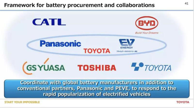 今年6月,豐田對外公開了其電動化戰(zhàn)略規(guī)劃及動力電池采購規(guī)劃,在這個規(guī)劃中,進入采購體系的電池包括松下、CATL、比亞迪、湯淺、東芝,而在這個動力電池供應鏈的聯盟中,松下和豐田與松下的合資公司處于最為核心的位置。