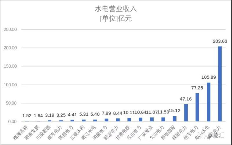 從水電上市企業(yè)財務中報選取營業(yè)收入科目,其中長江電力以203.64億元營業(yè)收入位于行業(yè)首位,而營業(yè)收入第二位的華能水電中報收入105.89億元,與長江電力相差近一倍。從上圖可以看到水電行業(yè)分化嚴重,主要的營收都集中在幾家龍頭企業(yè)上面。