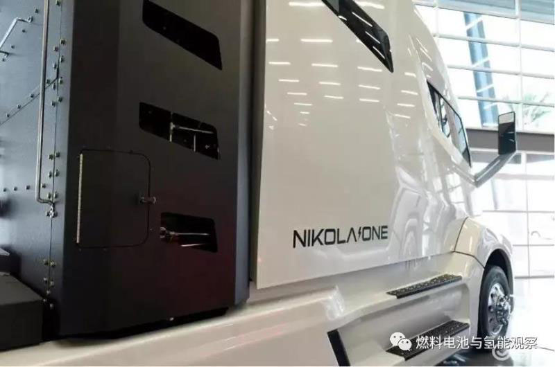 該公司總部的大廳里,一輛Nikola卡車駕駛室后面的氫氣燃料箱