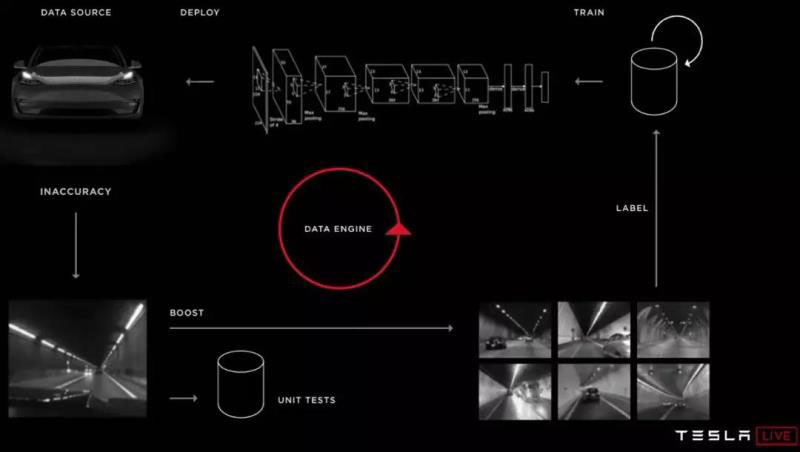 特斯拉在全球有超過70萬輛車在路上行駛,它把每輛車、每一個(gè)傳感器、每一個(gè)“事件”(即人與方向盤、制動(dòng)踏板等的相互作用)作為數(shù)據(jù)點(diǎn)。獲取這些數(shù)據(jù),對其進(jìn)行分析,并利用這些數(shù)據(jù)改進(jìn)算法,創(chuàng)建新的算法,并將這些改進(jìn)通過空中升級OTA傳送到車輛上。