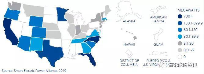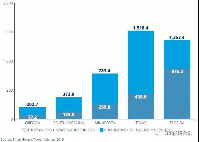 在競(jìng)爭(zhēng)日益激烈的太陽(yáng)能光伏經(jīng)濟(jì)和不斷增長(zhǎng)的消費(fèi)者需求的推動(dòng)下,5個(gè)州(累積公用事業(yè)供應(yīng)太陽(yáng)能超過100MW)在2018年經(jīng)歷了大幅增長(zhǎng)。