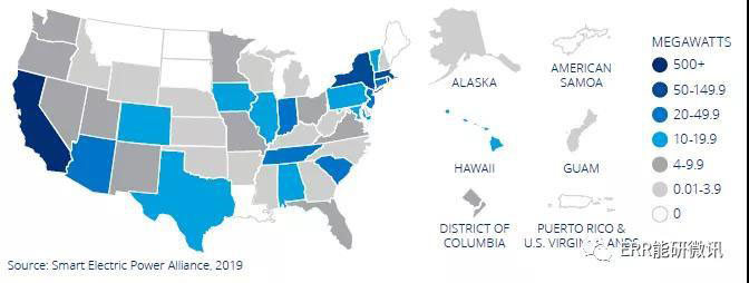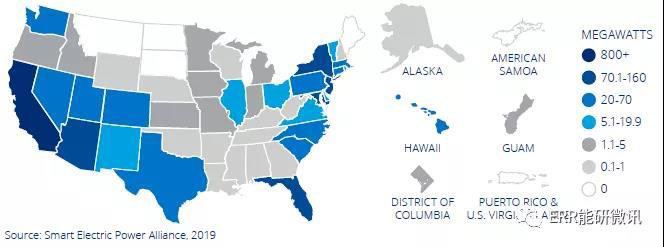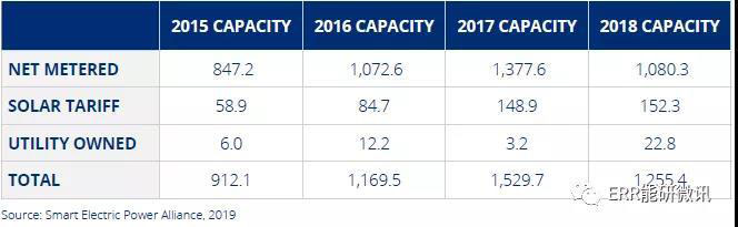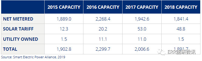 亞利桑那州、紐約州和新澤西州的公用事業(yè)在2017年和2018年的居民部門裝機(jī)容量中排名前五,但是新增系統(tǒng)比上年新增系統(tǒng)總數(shù)減少了12566個(gè),總裝機(jī)容量減少了87.4MW。