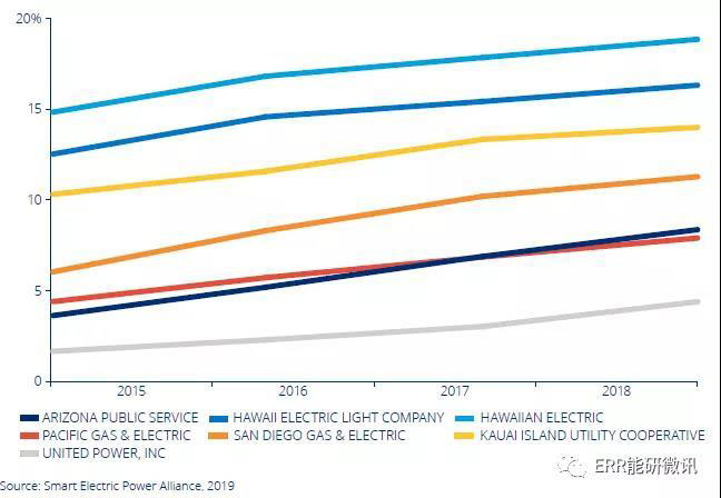 加州并不是2018年唯一持續(xù)的居民部門市場(chǎng)。在夏威夷,夏威夷電力公司繼續(xù)部署居民,滲透率達(dá)到其居民客戶賬戶的18.9%。