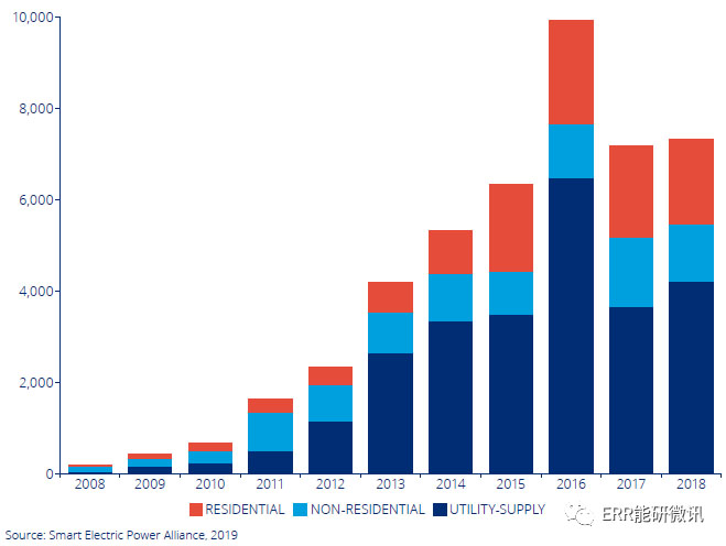 圖2 2008~2018年新增太陽(yáng)能裝機(jī)容量(MW-AC),按部門劃分