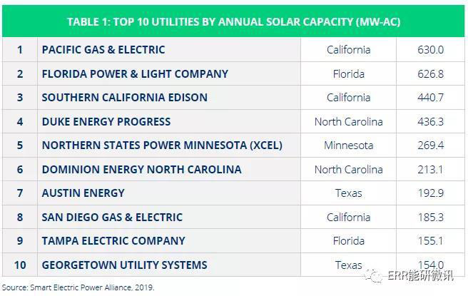 表1 按年度太陽(yáng)能裝機(jī)容量計(jì)算的十大公用設(shè)施(MW-AC)
