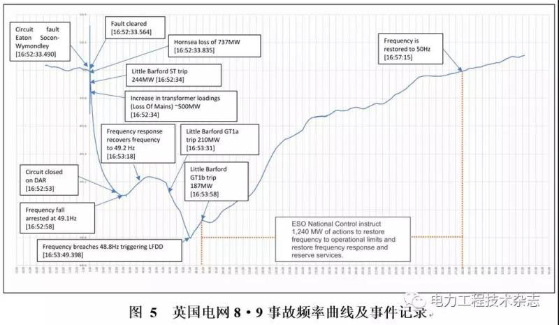 16:52:34:Little Barford電廠汽輪機跳閘,損失功率244 MW;配網(wǎng)分布式電源損失功率約500 MW。至此,系統(tǒng)損失功率達到約1481MW,超出系統(tǒng)1000 MW的頻率調(diào)節(jié)能力。