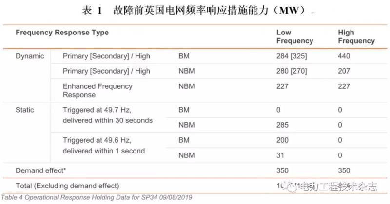 根據(jù)大不列顛SQSS對電網(wǎng)頻率的控制要求(一是系統(tǒng)穩(wěn)態(tài)頻率需控制在49.5~50.5 Hz之間,二是暫態(tài)期間頻率高于50.5 Hz或低于49.5 Hz的時間不超過60 s),系統(tǒng)需具備抵御1000 MW發(fā)電失去和560 MW負荷失去故障的能力。故障前,英國電網(wǎng)頻率響應措施能力如下表1所示,滿足SQSS對電網(wǎng)頻率的控制要求。