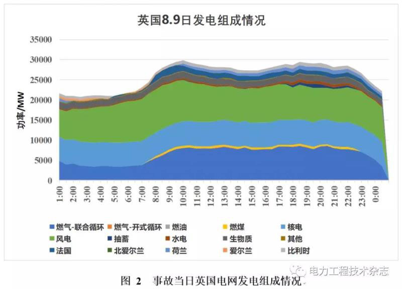 事故發(fā)生前,英國英格蘭和威爾士地區(qū)發(fā)布了氣象黃色預警,并伴有雷電。當?shù)貢r間16:52,英國電網(wǎng)負荷約28 GW,電力來源構(gòu)成為:30%風電,30%燃氣,20%核電,10%跨國輸電,以及約10%來自于水電、抽蓄、燃煤和生物質(zhì)能發(fā)電。8月9日,英國電網(wǎng)發(fā)電組成如圖2所示。