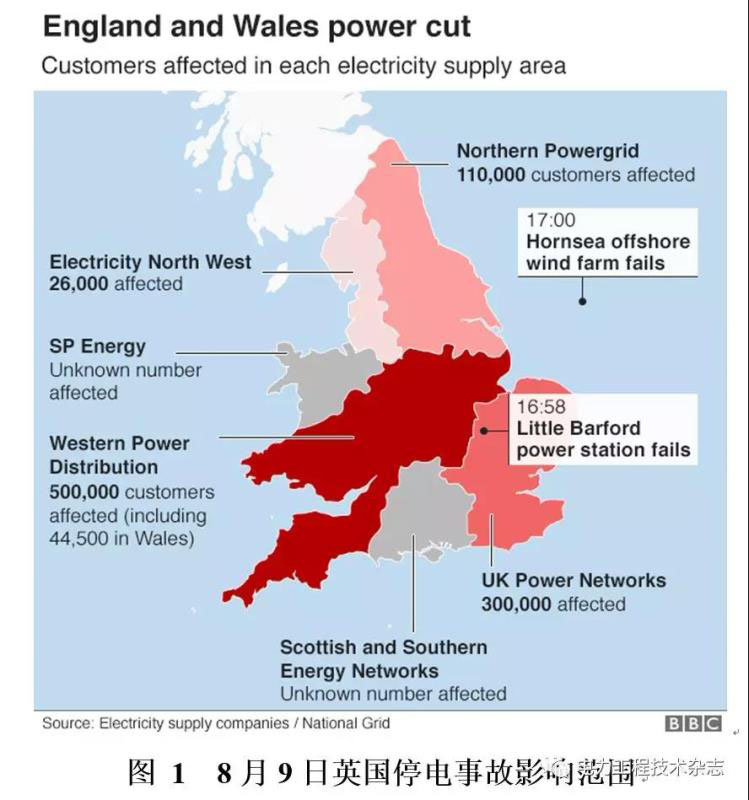當?shù)貢r間8月9日(周五)17:00(BST,英國夏令時,后同),英國發(fā)生大范圍停電,波及包括倫敦在內(nèi)的英格蘭和威爾士大部分地區(qū),約110萬人受到停電影響。由于停電正值周五下班高峰,火車、機場和公路癱瘓,且停電的同時倫敦多地還遭遇暴雨天氣,在各地引發(fā)嚴重混亂。此次停電事故影響范圍如下圖1所示。
