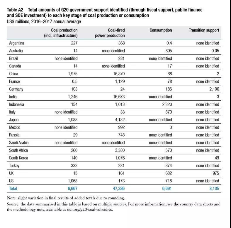 在G20各國中,中國對與煤炭領(lǐng)域支持力度最大,2016-2017年的資金支持達(dá)到平均每年189.15億美元,涉及煤炭生產(chǎn)(19.75億美元)、煤電(168.70億美元)、消費(fèi)(6800萬美元)、煤炭轉(zhuǎn)型(200萬美元)。在對煤電的資金支持中,大約95億美元用于支持海外的煤電項(xiàng)目。