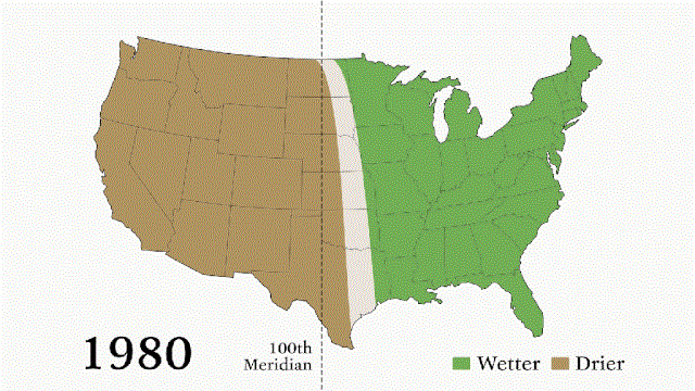 中國(guó)儲(chǔ)能網(wǎng)訊:美國(guó)本土100度子午線將美國(guó)潮濕的東部與干燥的西部分開(kāi),這條線穿過(guò)北達(dá)科他州、南達(dá)科他州、內(nèi)布拉斯加州、堪薩斯州、俄克拉荷馬州和德克薩斯州,這些州是美國(guó)的糧倉(cāng)。一旦你越過(guò)分界線,東方雨水浸透的草叢就會(huì)變成塵土飛揚(yáng)的平原,偶爾會(huì)有仙人掌點(diǎn)綴在景觀中。但是,據(jù)YaleEnvironment360報(bào)道,由于氣候變化這個(gè)著名的分界線自1980年以來(lái)向東移動(dòng)了140英里。
