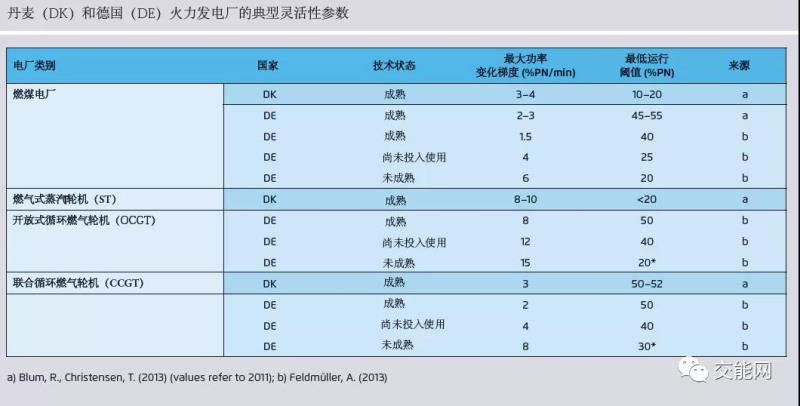 下表概述了基于不同來源的丹麥和德國發(fā)電廠的靈活性參數(shù)(Blum,R.,Christensen,T。(2013),F(xiàn)eldmüller,A。(2013))。與燃煤發(fā)電廠相比,燃氣發(fā)電廠的靈活性通常更高。開放式循環(huán)燃氣輪機(OCGT)和燃氣式蒸汽輪機(ST)在靈活性方面優(yōu)于聯(lián)合循環(huán)燃氣輪機(CCGT)。從下表可以看出,在所有考慮的類別中,丹麥發(fā)電廠的靈活性平均比德國發(fā)電廠更高。