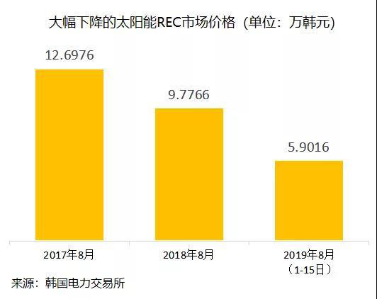 韓國電力交易所表示,本月1日至15日,太陽能REC的平均市場價格已跌至5.9016萬韓元(約合人民幣343.3元)。與2017年8月高達(dá)12.6976萬韓元(738.8元)的價格相比,跌幅超過50%。而在去年上半年,這一價格還曾超過10萬韓元(581.8元)。短短兩年時間,價格腰斬過半,讓依賴補(bǔ)貼的韓國光伏市場陷入不安。