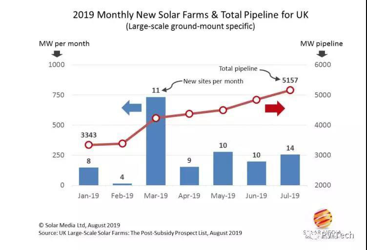 2019年年初的項(xiàng)目為3.34GW。但僅僅在過去的五個(gè)月,英國就新增了54個(gè)大型太陽能項(xiàng)目,許多原始開發(fā)商(英國首批8.5GW已完工大型太陽能電站的開發(fā)商)已重新回歸到未開發(fā)項(xiàng)目的識(shí)別和規(guī)劃工作。