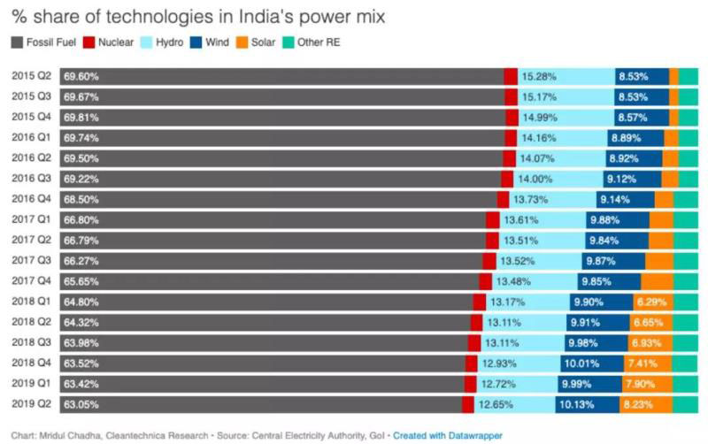根據(jù)CleanTechnica Research的數(shù)據(jù),截至2019年6月底印度的化石燃料發(fā)電占總裝機(jī)容量的比例連續(xù)第14個季度下降。在2019年第2季度末,基于煤炭、柴油、天然氣和石腦油的化石能源發(fā)電裝機(jī)(226吉瓦)比例已降至63.05%(而2015年第2季度這一比例為69.60%),可再生能源發(fā)電所占比例為:水電12.65%、風(fēng)電(36.3吉瓦)10.13%、光伏(29.5吉瓦)8.23%
