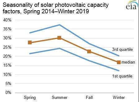 由于光照時(shí)間加長(zhǎng),光伏電站的性能在夏季達(dá)到峰值,與風(fēng)電形成季節(jié)性“互補(bǔ)”。光伏電站容量系數(shù)的中位數(shù):春季27.5%、夏季的30.2%、秋季的22.6%、冬季的16.7%。
