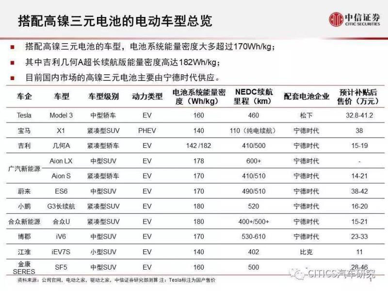 在國內(nèi)自主品牌上,已有包括吉利、廣汽、蔚來等多家車企的數(shù)十款車型宣布將應用高鎳體系電池。而在高鎳配套上,上述車企的車型基本全部由寧德時代配套。