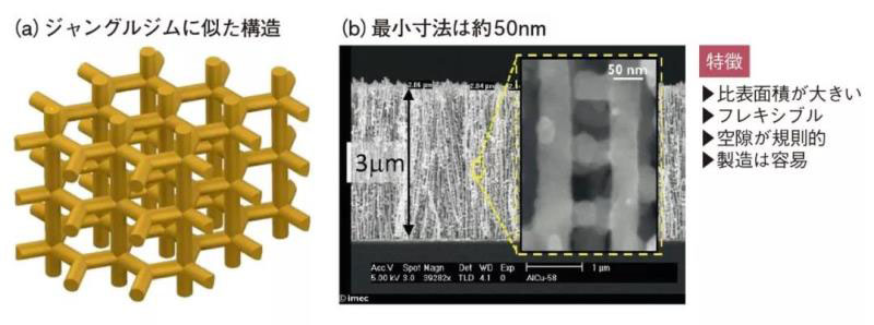 然而,IMEC也有表示在五年內(nèi)實(shí)現(xiàn)2~3 C的快速充電。2019年3月,該公司公布了其中一個(gè)技術(shù)(圖4)。它是一種“納米網(wǎng)狀電極”(IMEC),具有常規(guī)的氣隙,最小尺寸約50nm,非常小,具有多孔柔韌的特性?!斑@樣,即使在快速充電期間也可以抑制金屬Li負(fù)極的枝晶”(IMEC)但是,沒有公開原因的細(xì)節(jié)。