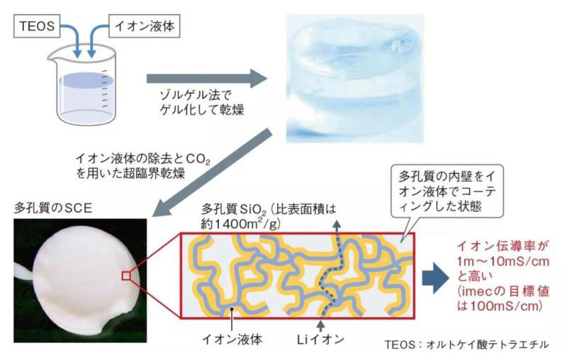 制造過程概要如下(圖3)。首先,將稱為TEOS ?的 Si基材料在離子液體中分散,加入水(水解),形成膠凝。除水后,采用CO2進(jìn)行超臨界干燥?。然后它變成一種非常輕的海綿狀固體材料,稱為“氣凝膠”。這是上述電解質(zhì)從液體變成固體的過程。