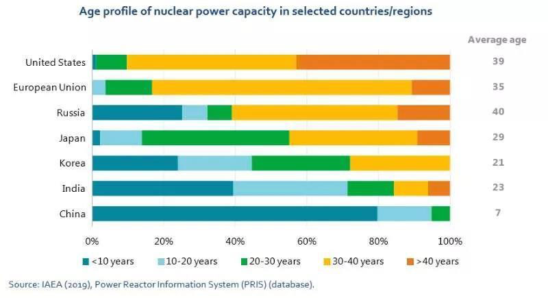 根據(jù)國(guó)際能源署(IEA)的統(tǒng)計(jì),到2019年各國(guó)核電機(jī)組的平均運(yùn)營(yíng)年齡是:俄羅斯40年、美國(guó)39年、歐盟35年、日本29年、韓國(guó)21年、印度23年、中國(guó)7年。