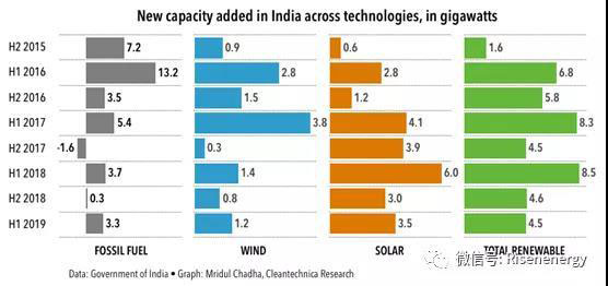 今年上半年,太陽能發(fā)電技術(shù)對印度新增發(fā)電能力的貢獻最大。在2019年1月至6月期間增加的7.8吉瓦新增產(chǎn)能中,太陽能占3.5吉瓦。