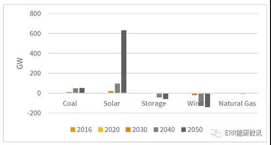 圖16 與國家既定政策情景相比,固定電網(wǎng)情景下不同電源裝機(jī)容量差額