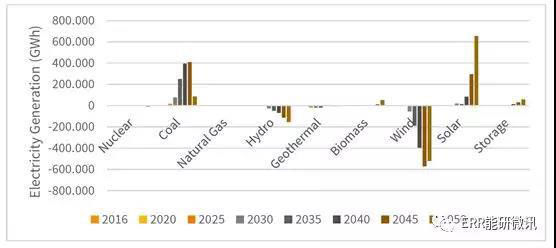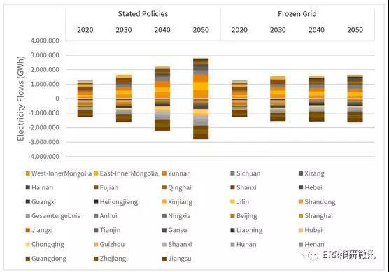 圖15 與國家既定政策情景相比,固定電網(wǎng)情景下不同能源發(fā)電量差額