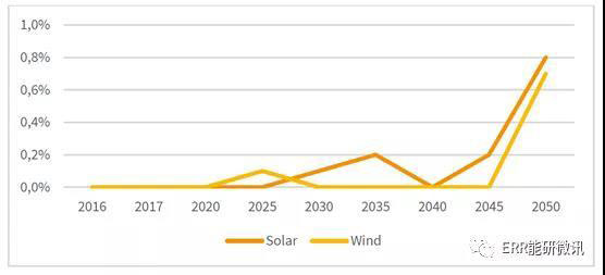 圖13 與國家既定政策情景相比,固定電網(wǎng)情景下風(fēng)電和光伏的棄電比例增加額