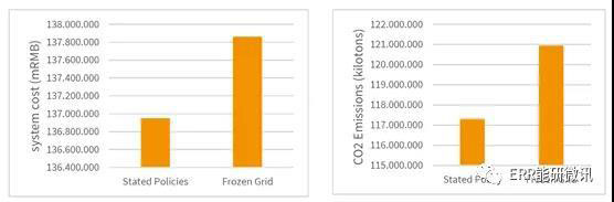 本文展示了基于場景建模結(jié)果的高級(jí)多標(biāo)準(zhǔn)電網(wǎng)規(guī)劃方法的優(yōu)勢。它將實(shí)施了優(yōu)化規(guī)劃和電網(wǎng)擴(kuò)建的中國可再生能源展望(CREO)2018既定政策情景與沒有電網(wǎng)規(guī)劃和電網(wǎng)擴(kuò)建的情景(這意味著電網(wǎng)將保持不變)進(jìn)行了比較。仿真模擬結(jié)果表明,合理規(guī)劃的電網(wǎng)可以降低整體系統(tǒng)成本和排放,更好地整合可再生能源,減少限電,如下圖所示。
