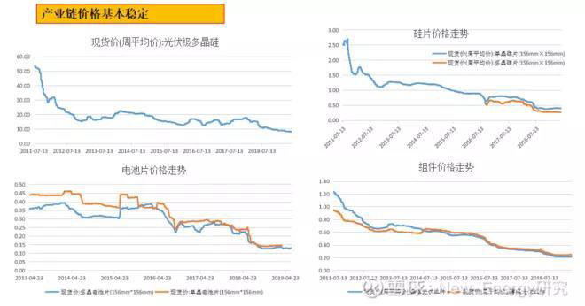 如果從時間角度來看,梳理歷年來光伏成本下降情況對最終需求的影響持續(xù)時間的話,一般從一輪成本快速下降之后新增需求能持續(xù)一整年,2016年那輪是,2011-2012年那輪也是,需求恢復(fù)后一般都伴隨著產(chǎn)業(yè)鏈價格的穩(wěn)定。由于基數(shù)以及成本下降放緩后面一年需求一般都不是都是會下滑(個別國家可能因為政策的原因有差異)。那么簡單拍腦袋的話,由于快速降本出現(xiàn)在18Q3,本輪需求改善應(yīng)該有可能會持續(xù)到19Q4。
