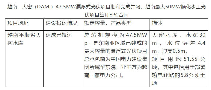 越南:大密(DAMI)47.5MW漂浮式光伏項(xiàng)目順利完成并網(wǎng),越南最大50MW順化水上光伏項(xiàng)目簽訂EPC合同