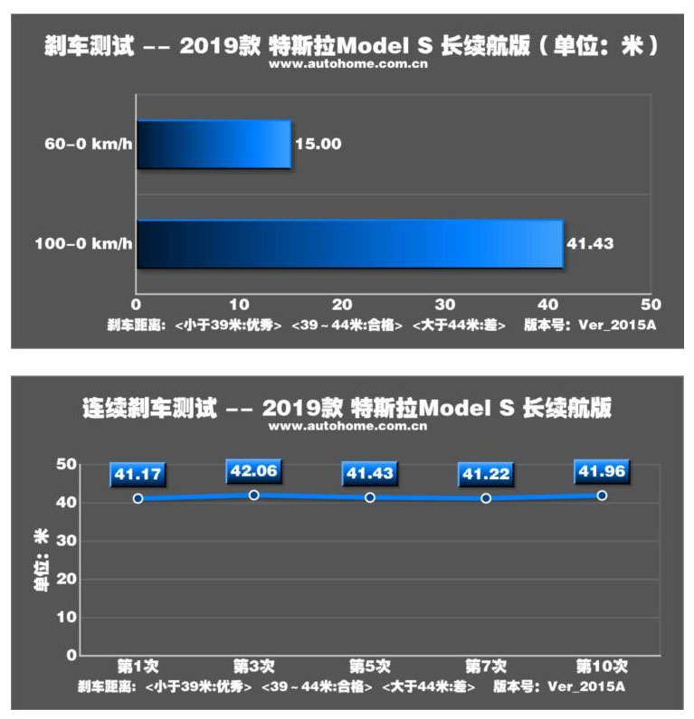 相較之下這臺(tái)車的制動(dòng)表現(xiàn)比較一般,定位全季胎的固特異Eagle Touring在緊急制動(dòng)狀態(tài)下抓地力略顯不足,再加上超過2噸的沉重車身帶來的巨大慣性,最終2019款特斯拉Model S長(zhǎng)續(xù)航版100-0km/h的平均剎車成績(jī)?yōu)?1.43m;不過連續(xù)極限制動(dòng)操作下,這臺(tái)車的制動(dòng)成績(jī)卻沒有出現(xiàn)明顯衰減,還是穩(wěn)定的維持在41m-42m之間。