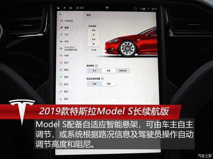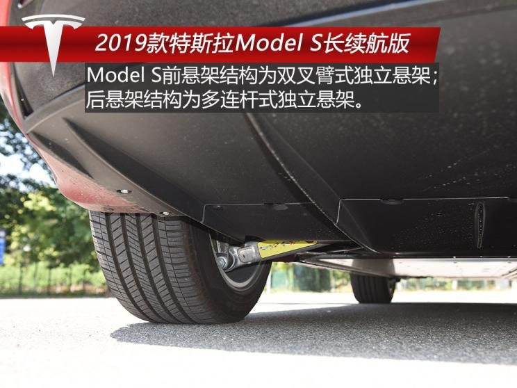 Model S的底盤被護(hù)板保護(hù)得非常嚴(yán)密,其前懸架結(jié)構(gòu)為雙叉臂式獨(dú)立懸架 后懸架結(jié)構(gòu)為多連桿式獨(dú)立懸架,Model S配備自適應(yīng)智能懸架,可由車主自主調(diào)節(jié)或系統(tǒng)根據(jù)路況信息及駕駛員操作來自動(dòng)調(diào)節(jié)高度和阻尼。