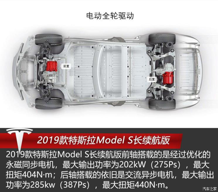 2019款特斯拉Model S長(zhǎng)續(xù)航版前軸搭載的是一臺(tái)經(jīng)過優(yōu)化的永磁同步電機(jī),最大輸出功率為202kW(275Ps),最大扭矩404N·m;后軸搭載的依舊是交流異步電機(jī),最大輸出功率為285kw(387Ps),最大扭矩440N·m;與電動(dòng)機(jī)匹配的是固定齒比的單速變速箱;電池包電量依舊為100kWh,被平鋪于車輛底部,起到了降低車輛重心,提升行駛穩(wěn)定性的效果。