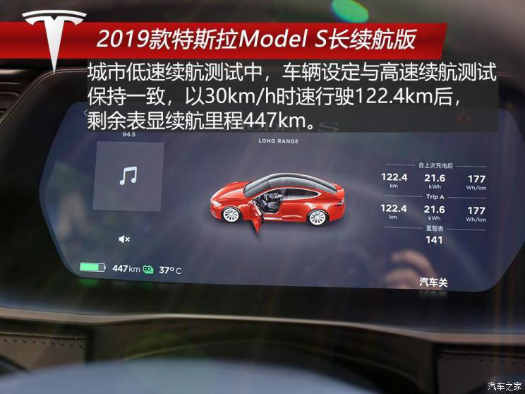 城市低速續(xù)航測(cè)試前同樣將車輛充滿電,滿電續(xù)航里程顯示同樣為584km,車輛設(shè)定也與高速測(cè)試保持完全一致。在以30km/h時(shí)速行駛122.4km后,剩余表顯續(xù)航里程447km,計(jì)算可得每行駛1km消耗的表顯續(xù)航里程為1.12km,滿電狀態(tài)下Model S城市低速續(xù)航約為522km。